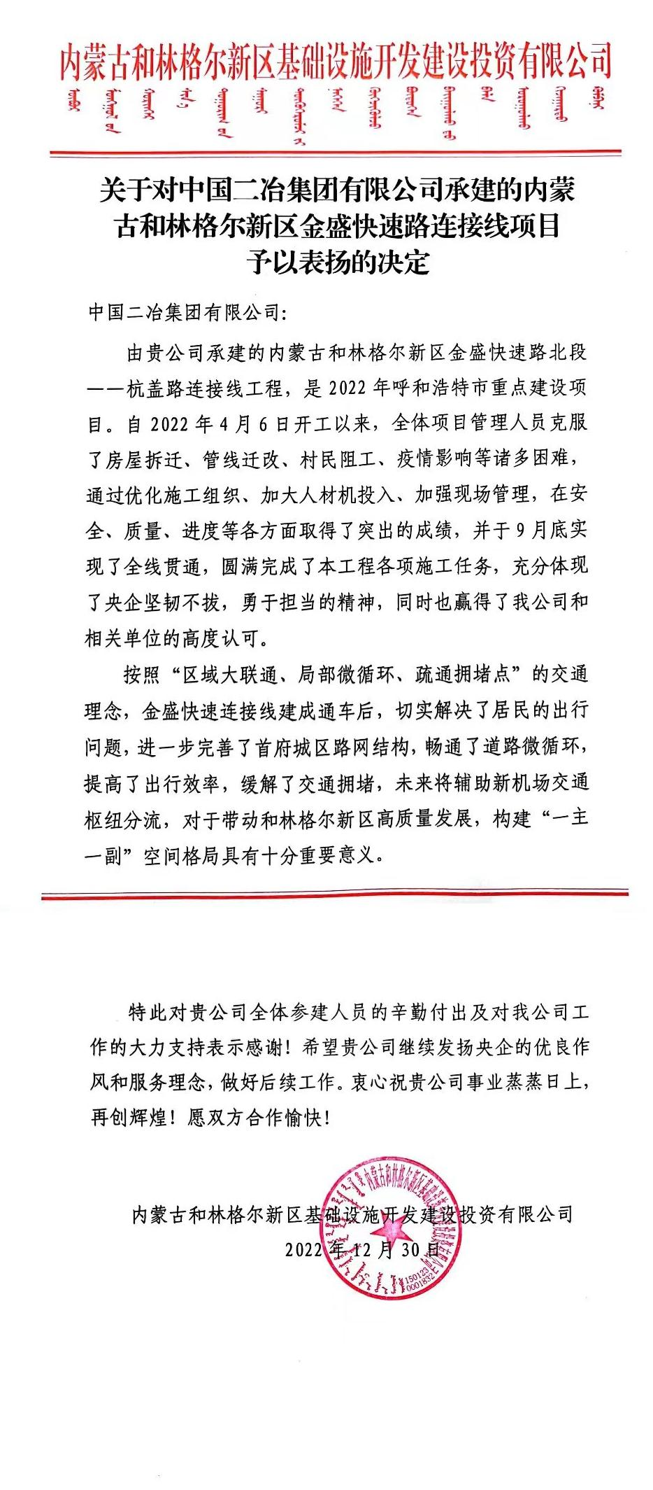 金盛快速路北段——杭蓋路連接線項目收到和林格爾新區(qū)基建公司表揚信。信中寫到,金盛快速路連接線項目是2022年呼和浩特市重點建設(shè)項目。自2022年4月6日開工以來,全體項目管理人員克服了房屋拆遷、管線遷改、疫情影響等諸多困難,通過優(yōu)化施工組織,加大人材機投入,加強現(xiàn)場管理,在安全、質(zhì)量、進度等各方面取得了突出的成績,并于9月底實現(xiàn)了全線貫通,圓滿完成了本工程各項施工任務(wù)。同時,也贏得了我公司和相關(guān)單位的高度認(rèn)可。