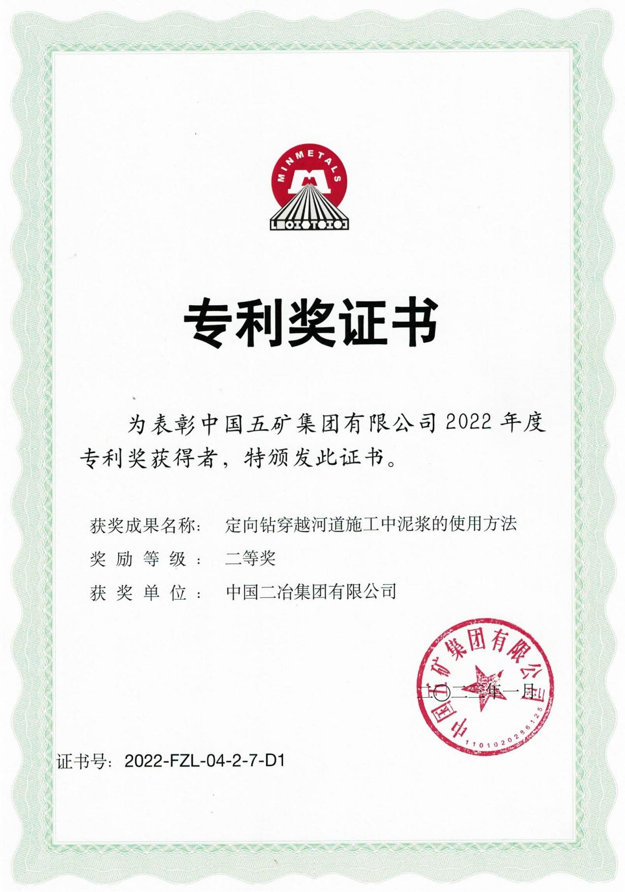 1月14日,中國(guó)二冶研發(fā)的專利“定向鉆穿越河道施工中泥漿的使用方法”榮獲中國(guó)五礦2022年度專利獎(jiǎng)二等獎(jiǎng)。