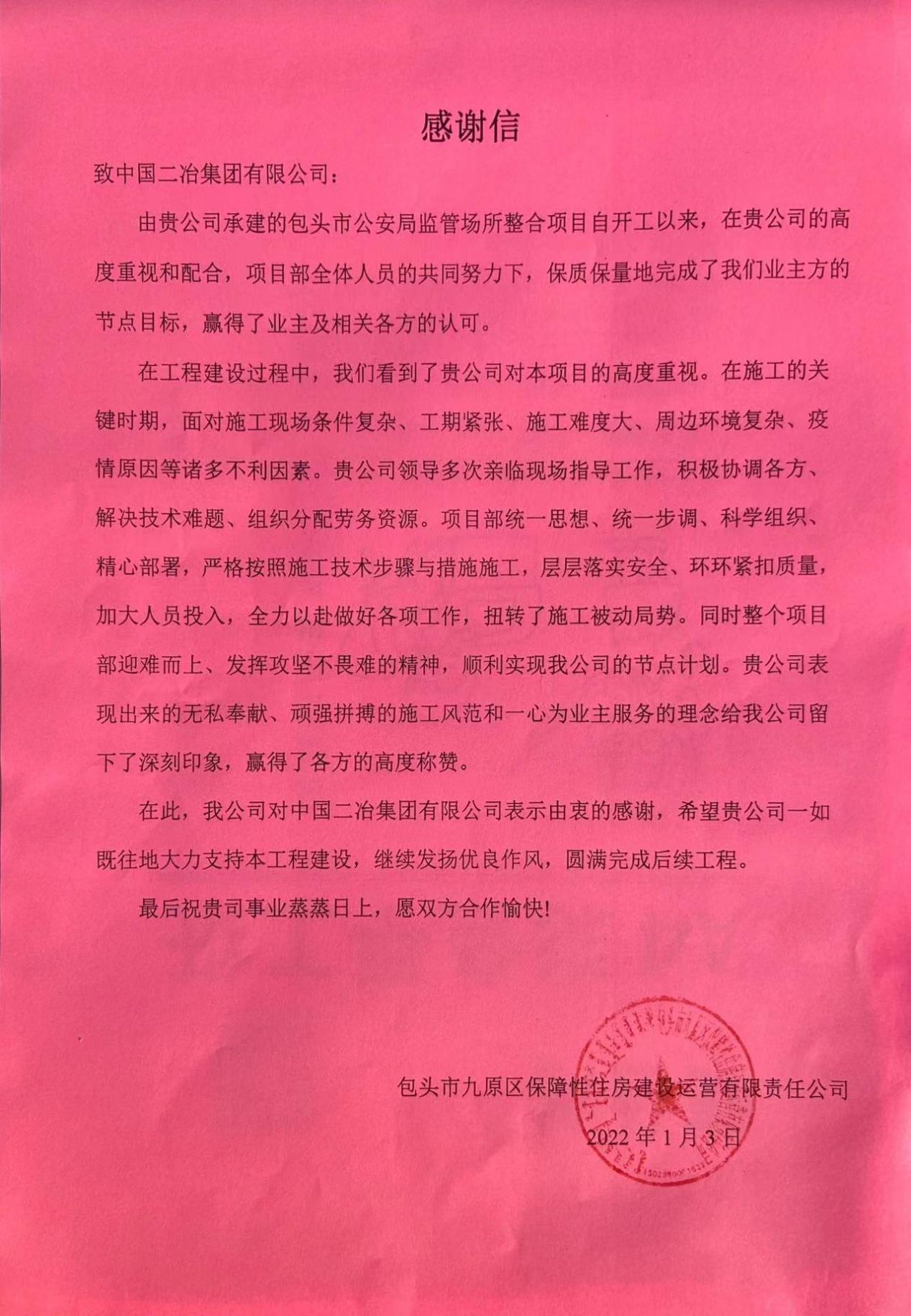 包頭市公安局監(jiān)管場所項目獲包頭市九原區(qū)保障性住房建設運營有限責任公司表揚,信中表示在施工的關鍵時期,面對施工現(xiàn)場條件復雜、工期緊張、施工難度大、周邊環(huán)境復雜、疫情原因等諸多不利因素,公司領導多次親臨現(xiàn)場指導工作,積極協(xié)調各方解決技術難題,組織分配勞務資源。項目部統(tǒng)一思想,統(tǒng)一步調,科學組織,精心部署,嚴格按照施工技術步驟與措施施工,層層落實安全,環(huán)環(huán)緊扣質量,加大人員投入,全力以赴做好各項工作,扭轉了施工被動局勢。項目部全體迎難而上,發(fā)揮攻堅不畏難的精神,順利實現(xiàn)節(jié)點目標。所表現(xiàn)出來的無私奉獻、頑強拼搏的施工風范和一心為業(yè)主服務的理念,贏得了各方的高度稱贊。希望中國二冶一如既往地大力支持工程建設,繼續(xù)發(fā)揚優(yōu)良作風,圓滿完成后續(xù)工程。