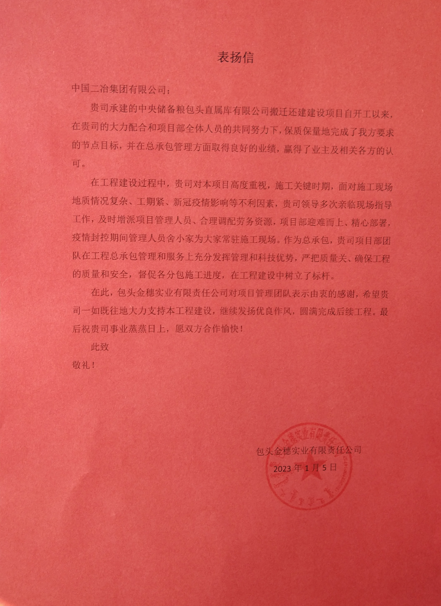 春節(jié)前夕,中國二冶城建分公司承建的公安局監(jiān)管場所項目、中央儲備糧包頭直屬庫有限公司搬遷還建建設項目先后獲表揚信,信中對項目全體參建人員保質保量完成節(jié)點目標和公司先進的管理理念表示高度肯定,并對未來合作發(fā)展提出展望。