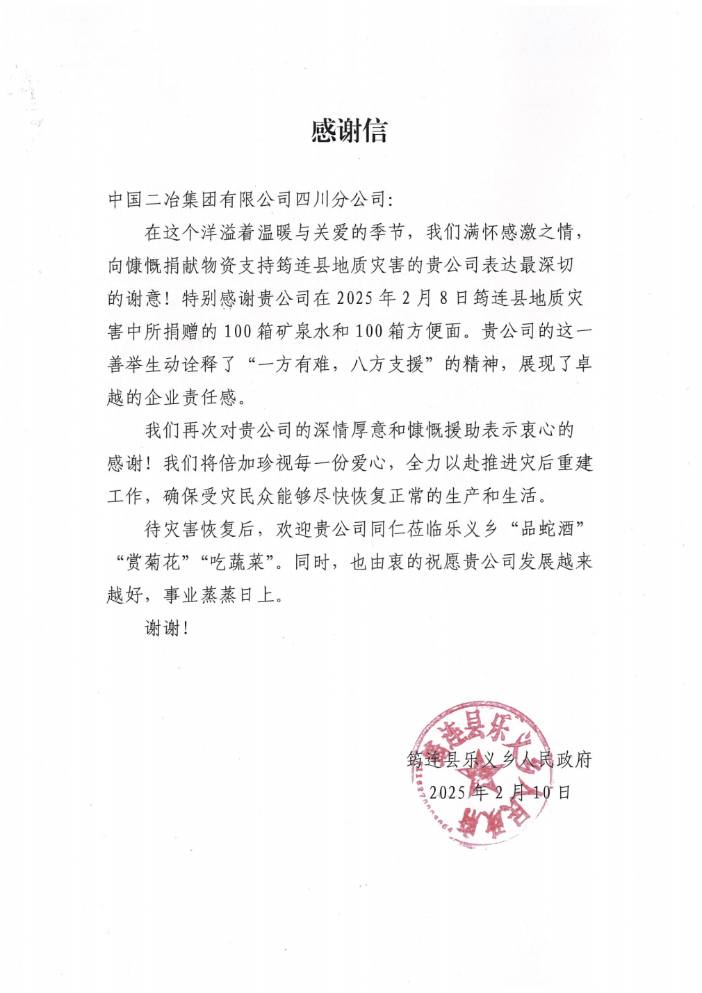 2月10日,中國二冶收到四川省宜賓市筠連縣樂義鄉(xiāng)人民政府感謝信,對(duì)中國二冶捐贈(zèng)物資支持宜賓市筠連縣山體滑坡?lián)岆U(xiǎn)救援工作表示敬意和感謝!