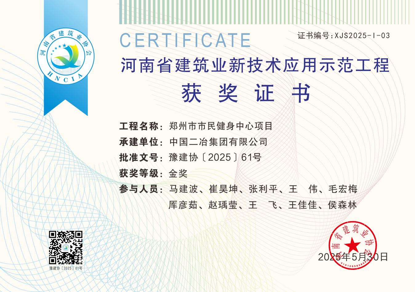 6月4日,中國(guó)二冶承建的鄭州市市民健身中心項(xiàng)目榮獲2025年“河南省建筑業(yè)新技術(shù)應(yīng)用示范工程”榮譽(yù)稱號(hào)。