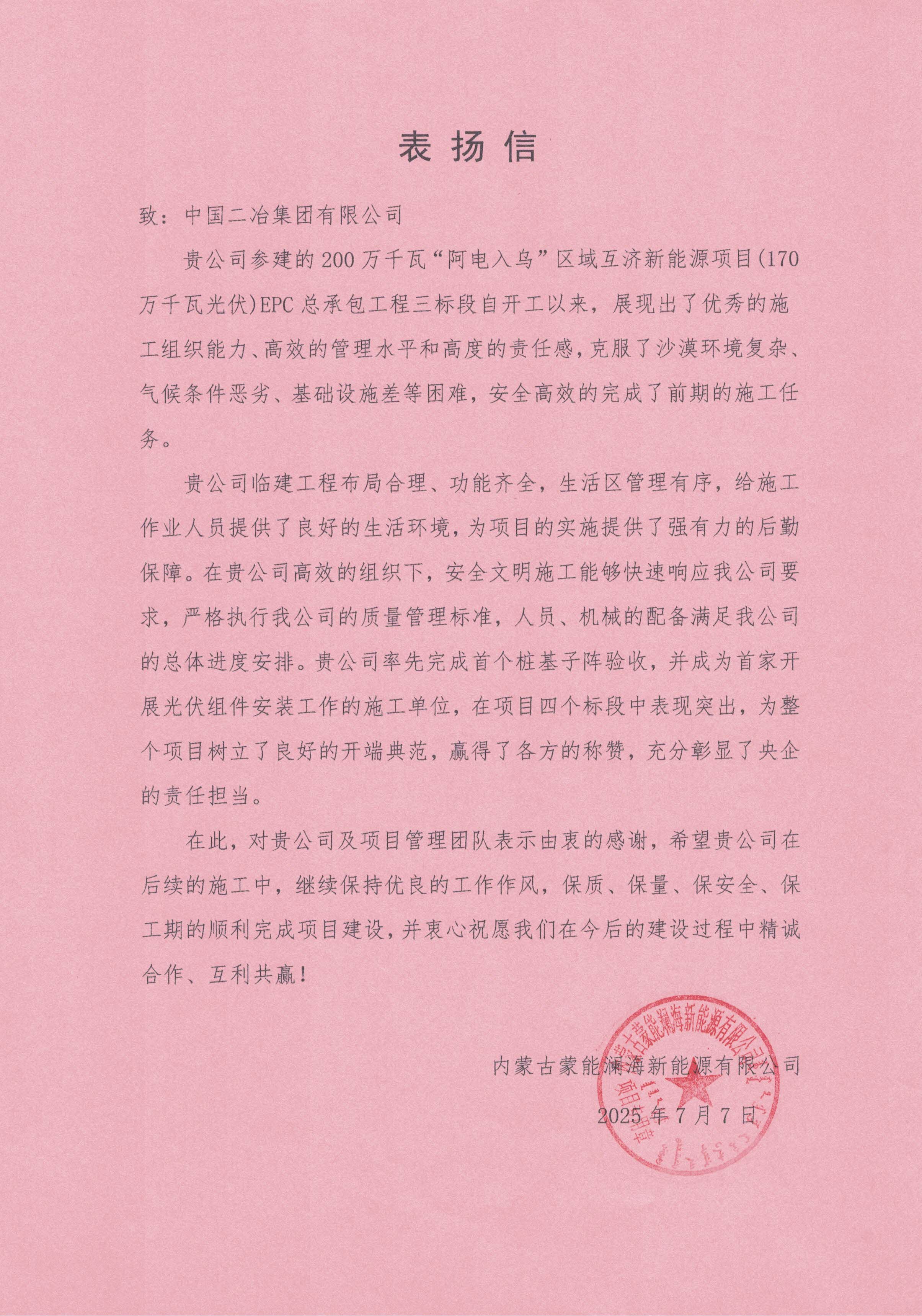 近日,中國二冶收到內蒙古蒙能瀾海新能源有限公司表揚信,對中國二冶200 萬千瓦“阿電入烏”區(qū)域互濟新能源項目(170萬千瓦光伏)EPC總承包工程三標段施工中的出色表現(xiàn)予以高度肯定。