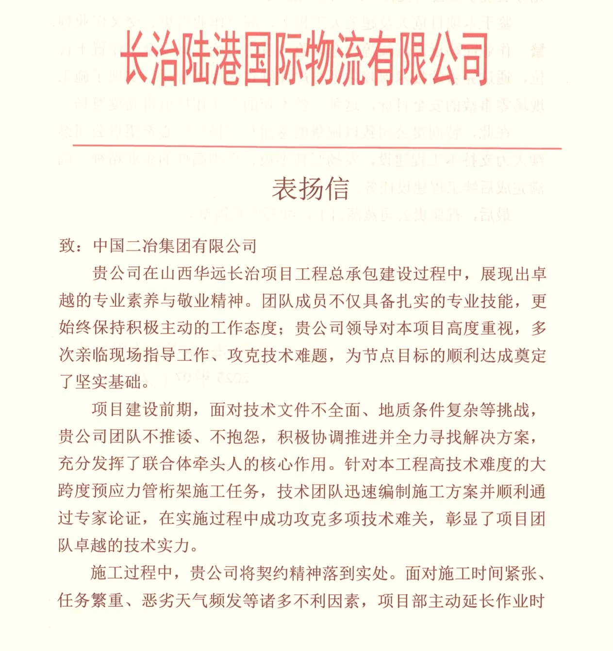 7月23日,中國二冶收到來自長治陸港國際物流有限公司表揚(yáng)信。對(duì)中國二冶鋼構(gòu)公司山西長治項(xiàng)目管理團(tuán)隊(duì)攻堅(jiān)克難,順利實(shí)現(xiàn)項(xiàng)目既定目標(biāo)提出表揚(yáng)。