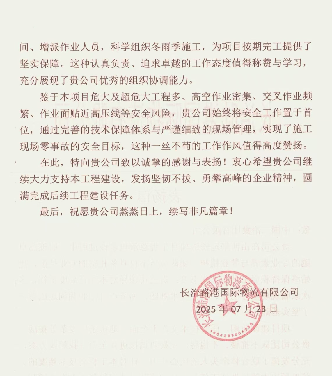 信中指出,工程自進(jìn)場施工以來,貴公司領(lǐng)導(dǎo)對(duì)本項(xiàng)目高度重視,多次親臨現(xiàn)場指導(dǎo)工作、攻克技術(shù)難題,為節(jié)點(diǎn)目標(biāo)的順利達(dá)成奠定了堅(jiān)實(shí)基礎(chǔ)。在實(shí)施過程中,項(xiàng)目管理團(tuán)隊(duì)攻克多項(xiàng)技術(shù)難關(guān),保質(zhì)保量按照計(jì)劃實(shí)現(xiàn)了預(yù)期目標(biāo),彰顯了項(xiàng)目團(tuán)隊(duì)卓越的技術(shù)實(shí)力。特別是施工關(guān)鍵時(shí)期,由于本項(xiàng)目存在危大及超危大工程多,高空作業(yè)密集,交叉作業(yè)頻繁等安全風(fēng)險(xiǎn),為此,項(xiàng)目管理團(tuán)隊(duì)始終將安全工作置于首位,通過完善的技術(shù)保障體系與嚴(yán)謹(jǐn)細(xì)致的現(xiàn)場管理,實(shí)現(xiàn)了施工現(xiàn)場零事故的安全目標(biāo)。